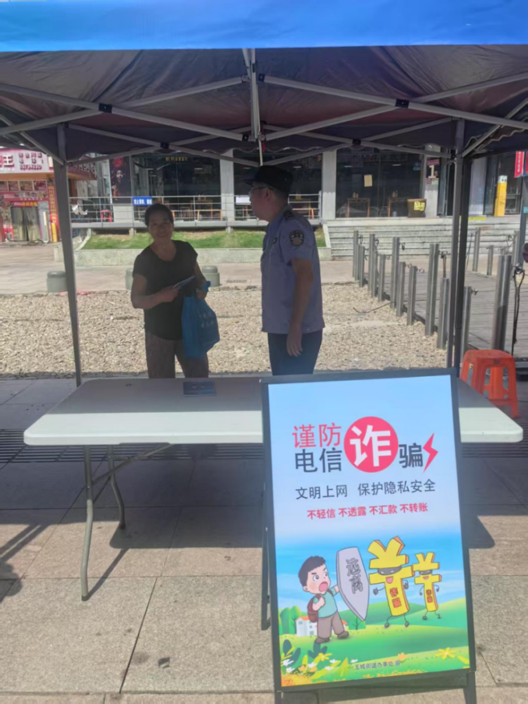 8月8日上午,玉城街道联合派出所、南门社区,在公益集市开展“文明上网 保护隐私安全”主题宣传活动,现场向往来群众发放宣讲册,普及安全上网、保护隐私的重要性,希望通过此次活动,进一步提高居民的网络安全意识,提醒群众谨防电信诈骗,为网络文明保驾护航。